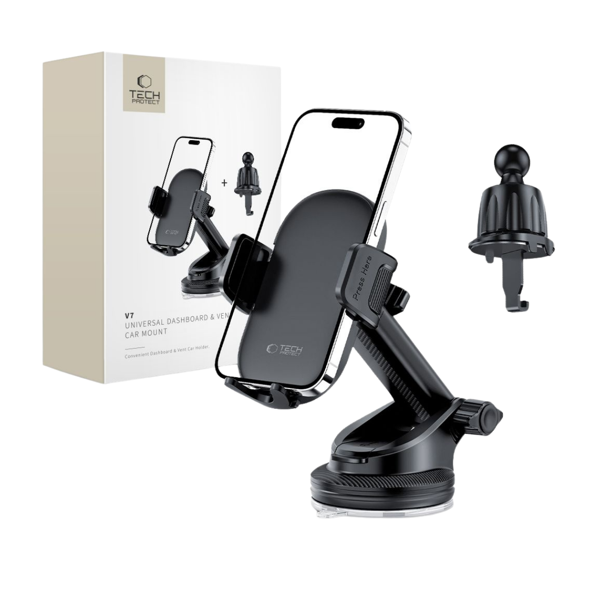 Tech-Protect V7 univerzalni auto držač za mobitel omogućuje sigurno i stabilno postavljanje uređaja u automobilu. Dizajniran je za montažu na armaturu ili ventilacijski otvor, što omogućuje praktično korištenje navigacije, poziva i drugih funkcija tijekom vožnje.